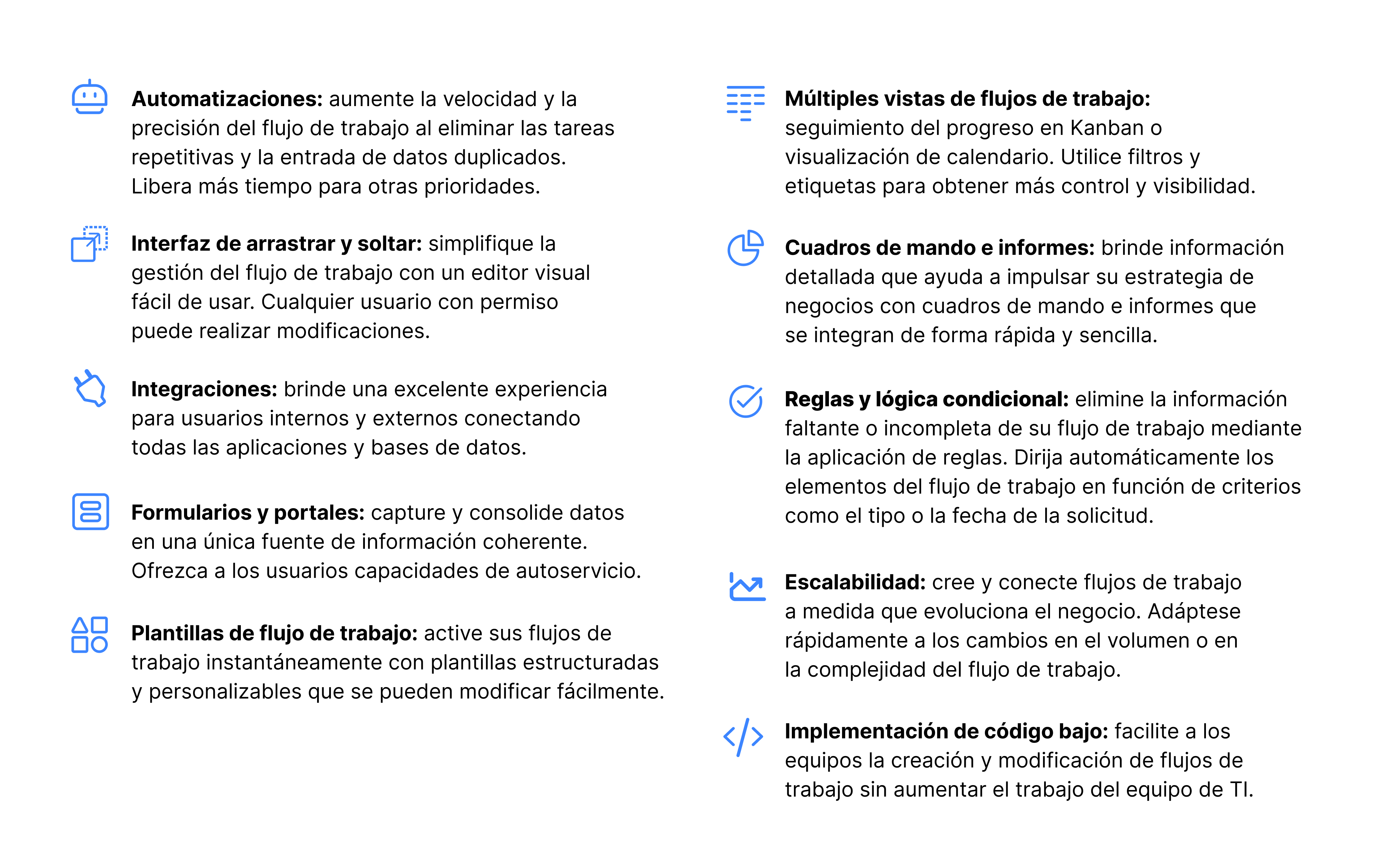 | Leaves more time for strategic work | When processes are organized and manual work is automated, teams can spend less time trying to understand how to perform a specific process, and more time crunching the numbers, building reports, and making sound business decisions. |
