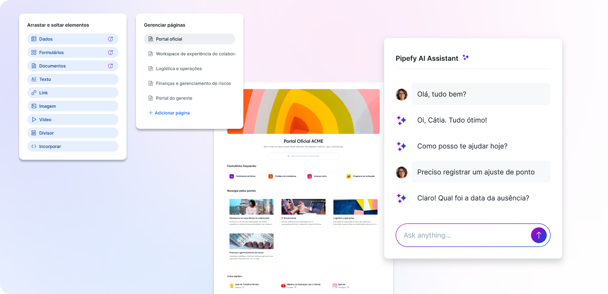 Monte formulários e portais para centralizar solicitações. Estruture pipes e cards para acompanhar tarefas com clareza e controle.