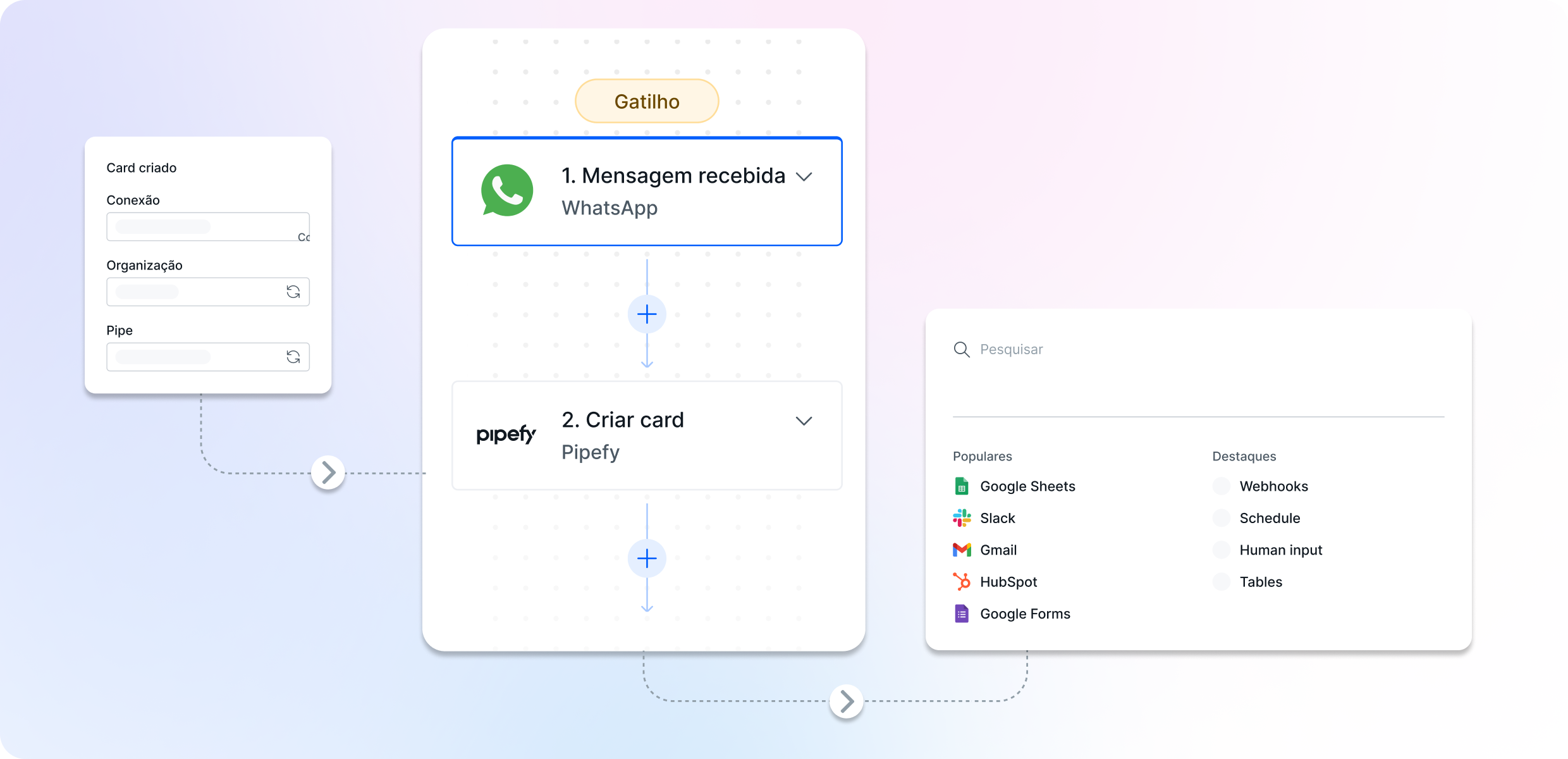 Monte formulários e portais para centralizar solicitações. Estruture pipes e cards para acompanhar tarefas com clareza e controle.