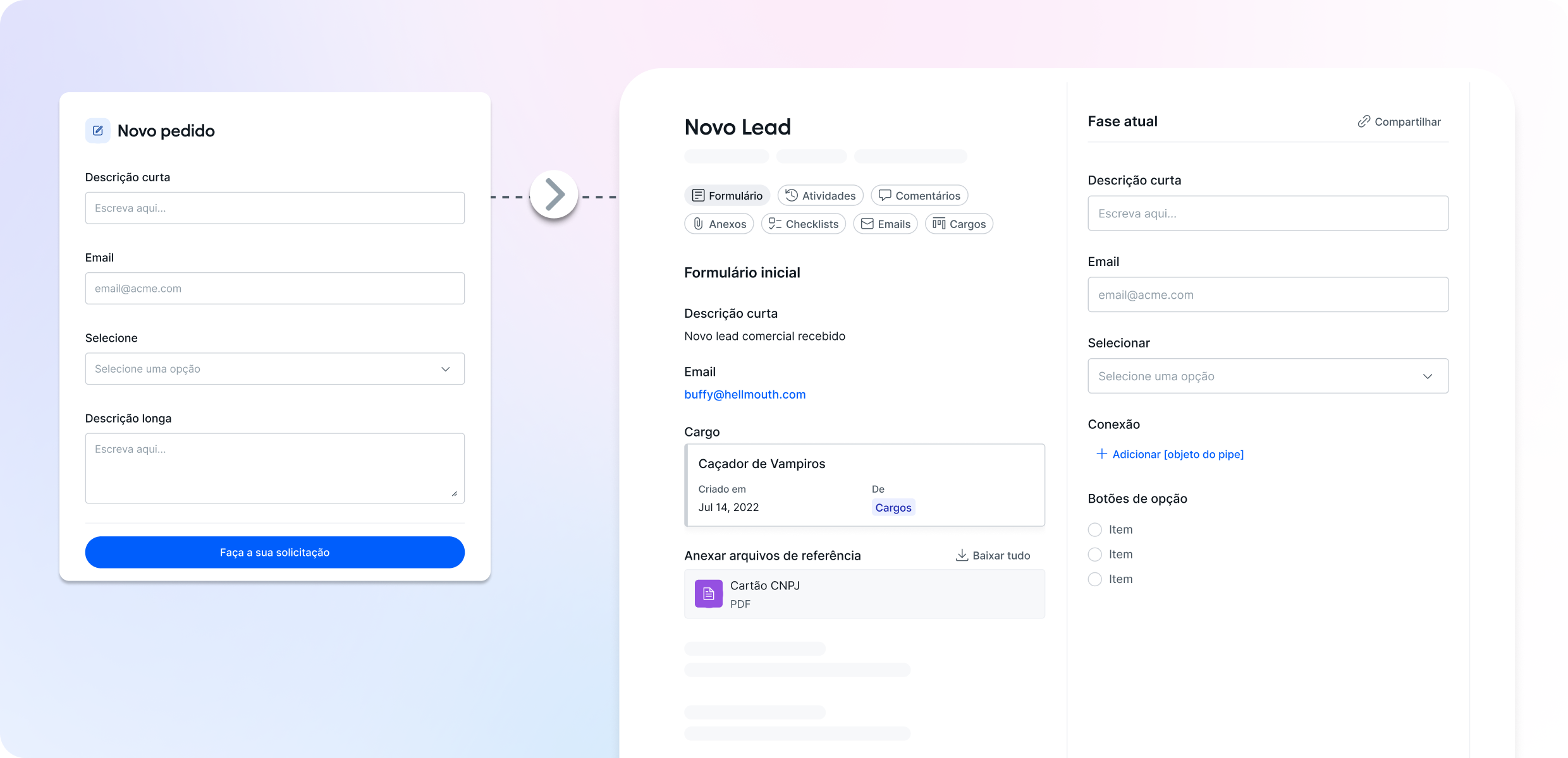 • A solicitação é criada no Pipefy