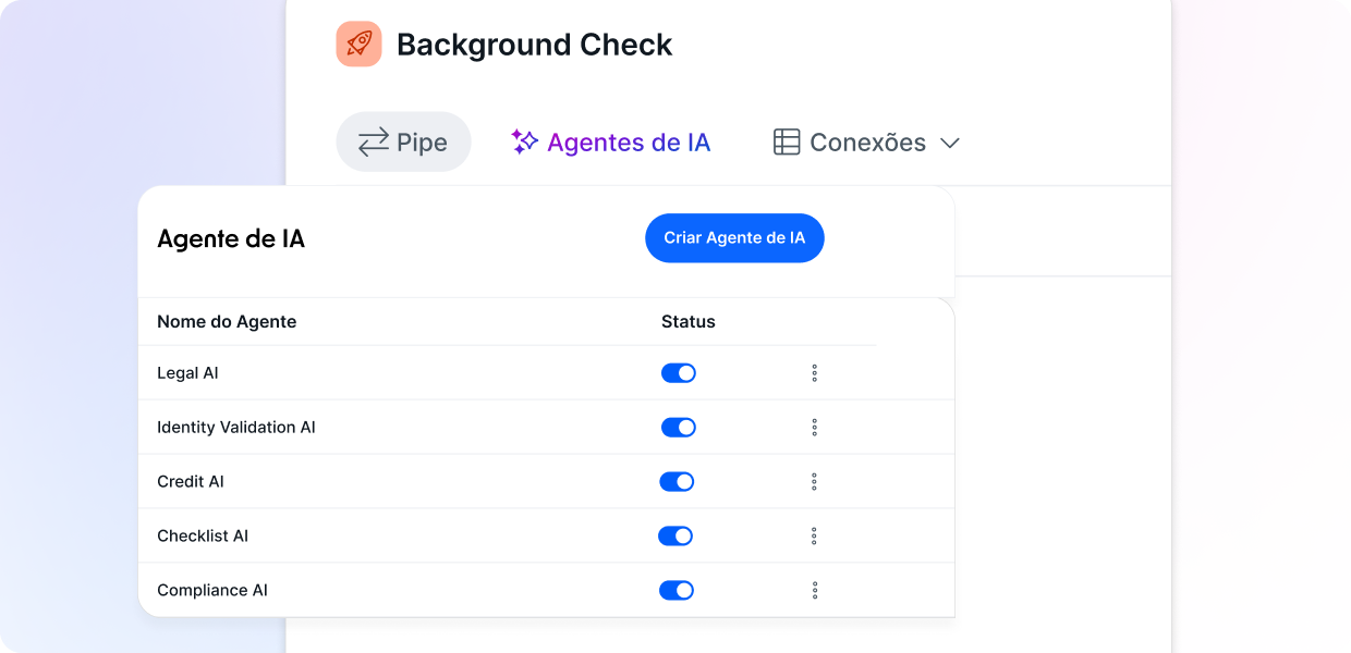 Integração automática com bureaus e bases públicas.rnrnChecklist AI (BGC) confirma a completude das validações.