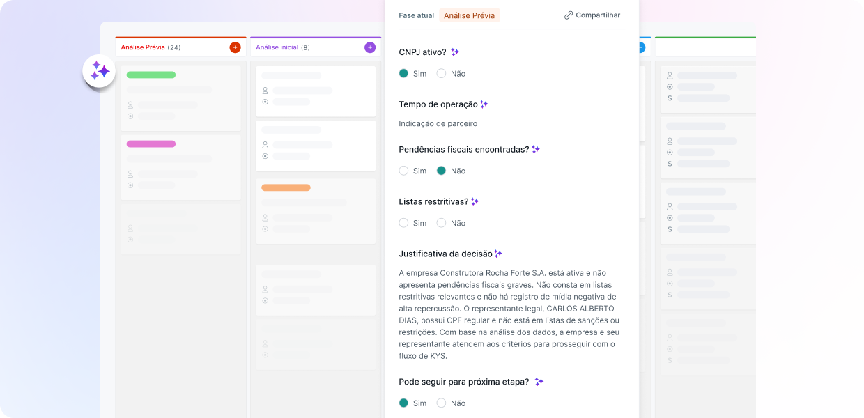 Executa checagens automáticas de compliance, PEPs e listas restritivas para pessoas físicas e jurídicas.