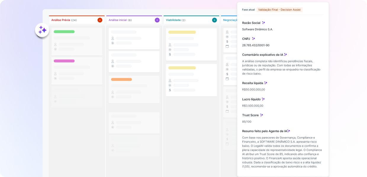 DecisionAssistAI (Credit) consolida todos os dados e aplica as políticas de crédito.